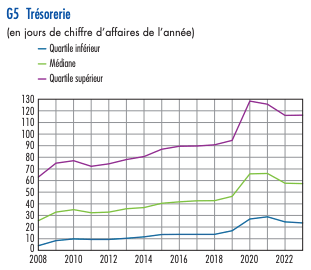 Cependant, des disparités existent : 25 % des ETI affichaient une trésorerie inférieure à 24 jours en 2023, un chiffre en progression par rapport à 2019 (17 jours).